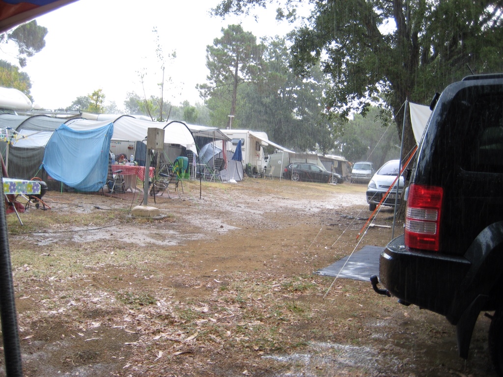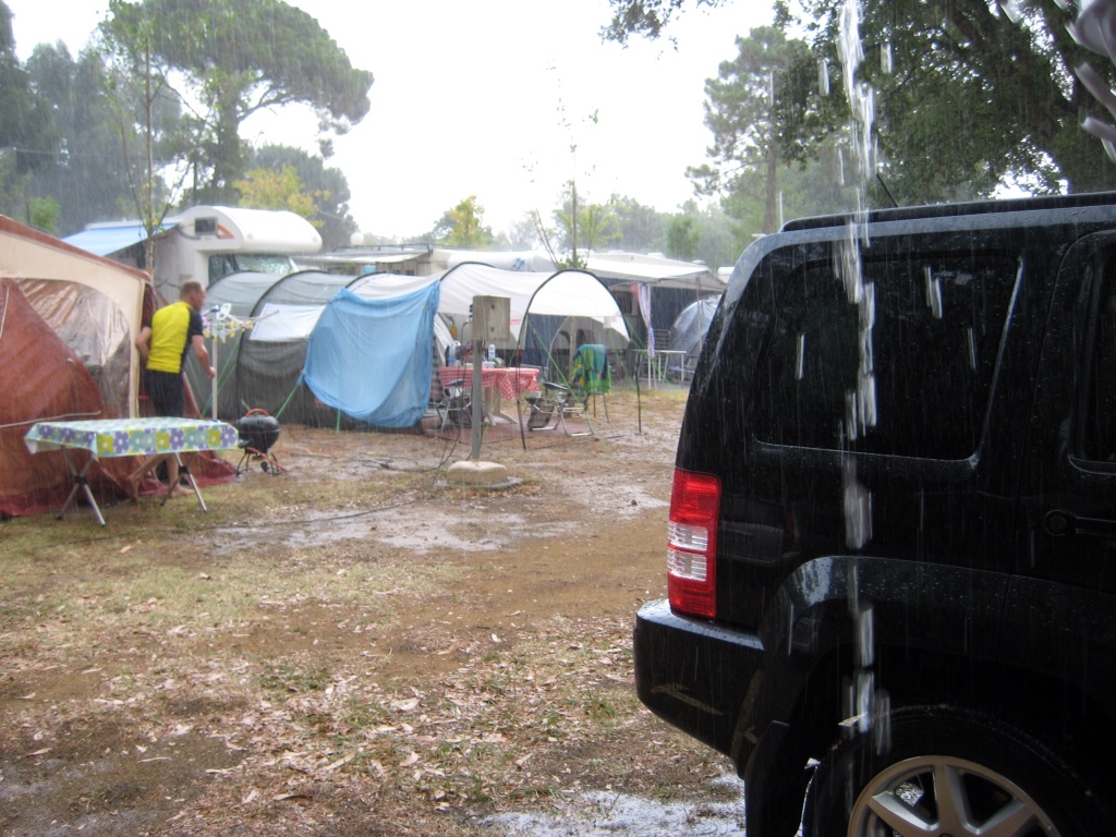 Så kom regnen. Genboen er på vej over for at sætte plastik pose på strømskabet, for at redde strømmen, som vi har haft en del problemer med.