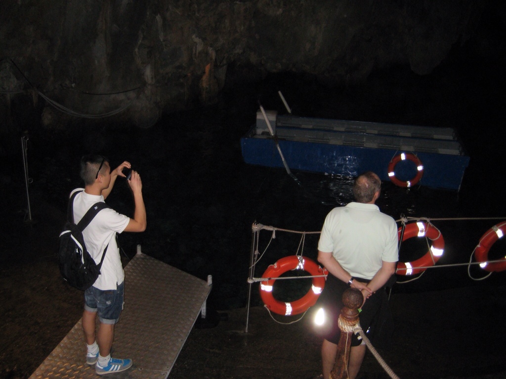 Vi venter på at skulle sejle med en lille robåd. Vi er transporteret ned med en elevator.