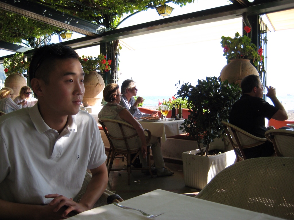 Vi spiser pizza på en restaurant helt nede på stranden. Flot sted men dårlige pizzaer