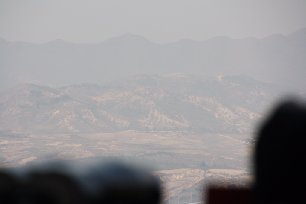 På en udsigtsplads til nord. Meget skrappe regler for hvor tæt man må gå for at fotografere. Går du over den gule streg, kommer en soldat og sletter dit billede. En ældre koreansk dame ville ikke finde sig i det og kom næsten op at slås med en soldat, der måtte tage hårdhændet fat.