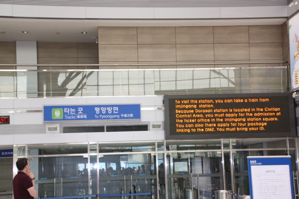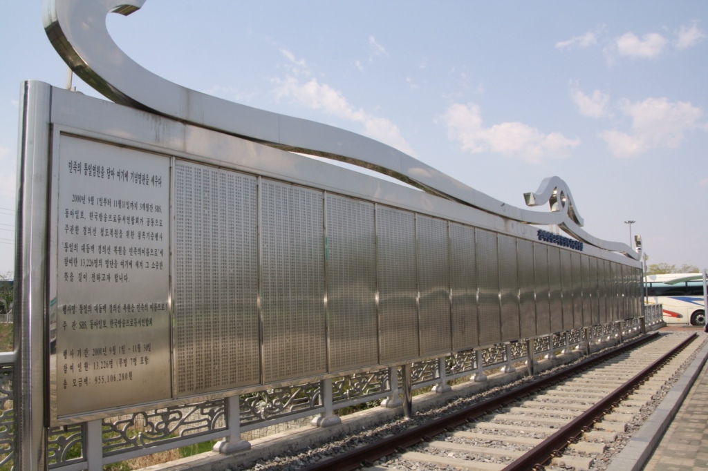 Dorasan station. Bygget af syd korea for 6 år siden. De ville forbinde den sibiriske jernbane her fra gennem Nordkorea. Der ligger kæmpe opbevarings haller ved siden af til gods. Her er alle dem der har sponsoreret .