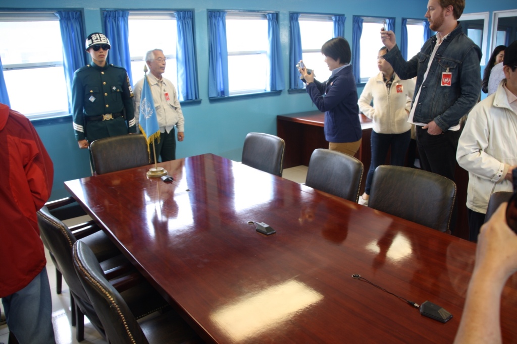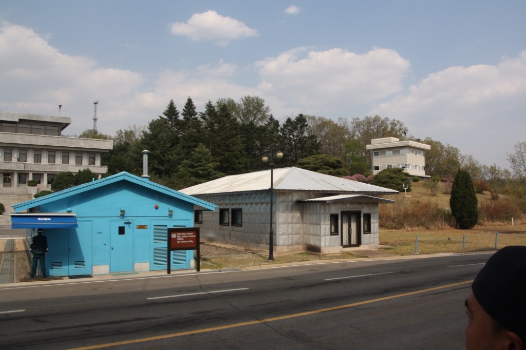 Idag var vi på tur til den demilitarizerede zone og til Panmunjeom, hvor Nordkorea og Sydkorea har et konference rum, grænsen går midt gennem rummet. Vi var inde i rummet og var lige en kort smut i Nordkorea , altså på den anden side af bordet.