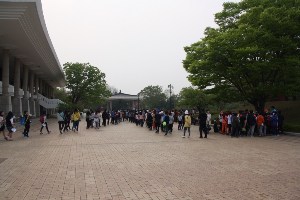 Gyeongju Shilla museet. Der var så mange skolebørn. De var utrolig larmende og løb rundt. Pludselig lød en fløjte og alle børn stillede op i fire rækker hos hver deres lærer. Da læreren gik blev rækkerne til rækker af to og to hvor de gik fint. Måske den megen diciplin giver megen uro. Det skal dog siges, at da de gik i rækker, havde de både mobiler og vanddunke/ mad fremme. Alle børn har mobiler selv de helt små (samsung naturligvis)
