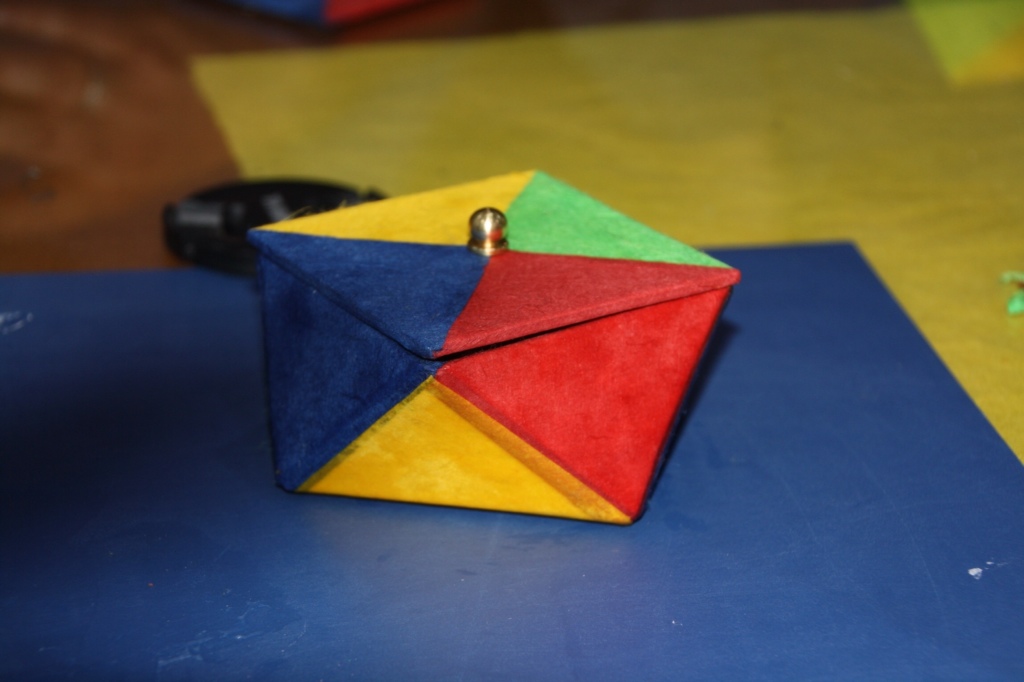 Vi bekældte gavedåser med farvet hjemmelavet papir.