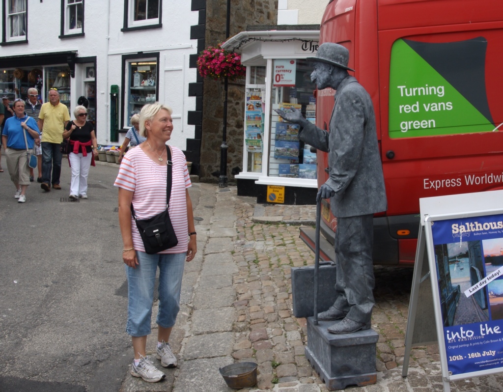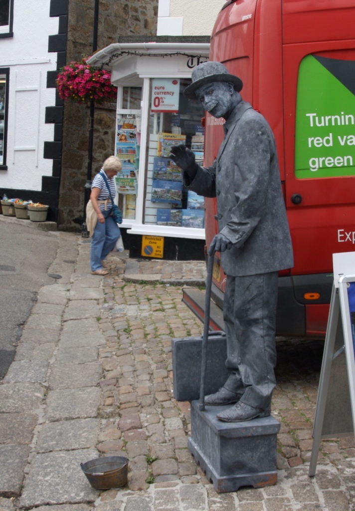 En mand klædt ud som statue. Det var kun på grund af bøtten på jorden vi så han var levende. Gav man penge gav han enten hånden eller fingerkys. Her havde Tina givet et pund og han kvitterede med fingerkys.