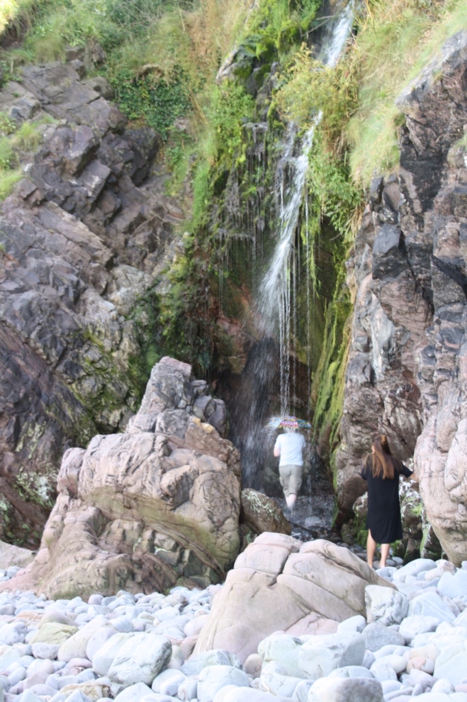 Ole Martin skal naturligvis prøve at gå under vandfaldet med paraply. Julie havde lovet at gøre det bagefter, men fortrød (kylling)