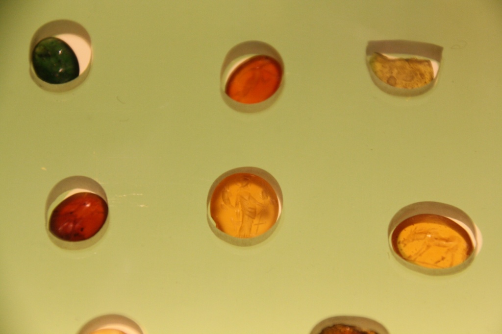 Disse små sten meget mindre ind en 25 øre har siddet i ringene på romerne og er faldet af i badene. Der er indgraveret billeder i dem.