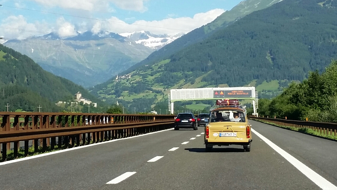 På motorvejen møder vi denne trabant med kuffert på taget. Vi ser den fylder benzin på foran og også olie i tanken som hører sig til.