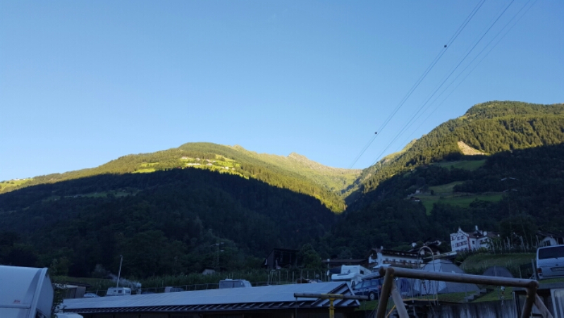 Så er kl. Syv om morgenen på campingpladsen i Merano. Vi er parat til at tage afsked. Læg mærke til, at solen ikke når ned i dalen. Det samme skete om eftermiddagen. Kl. Fem var solen gået ned bag bjerget.