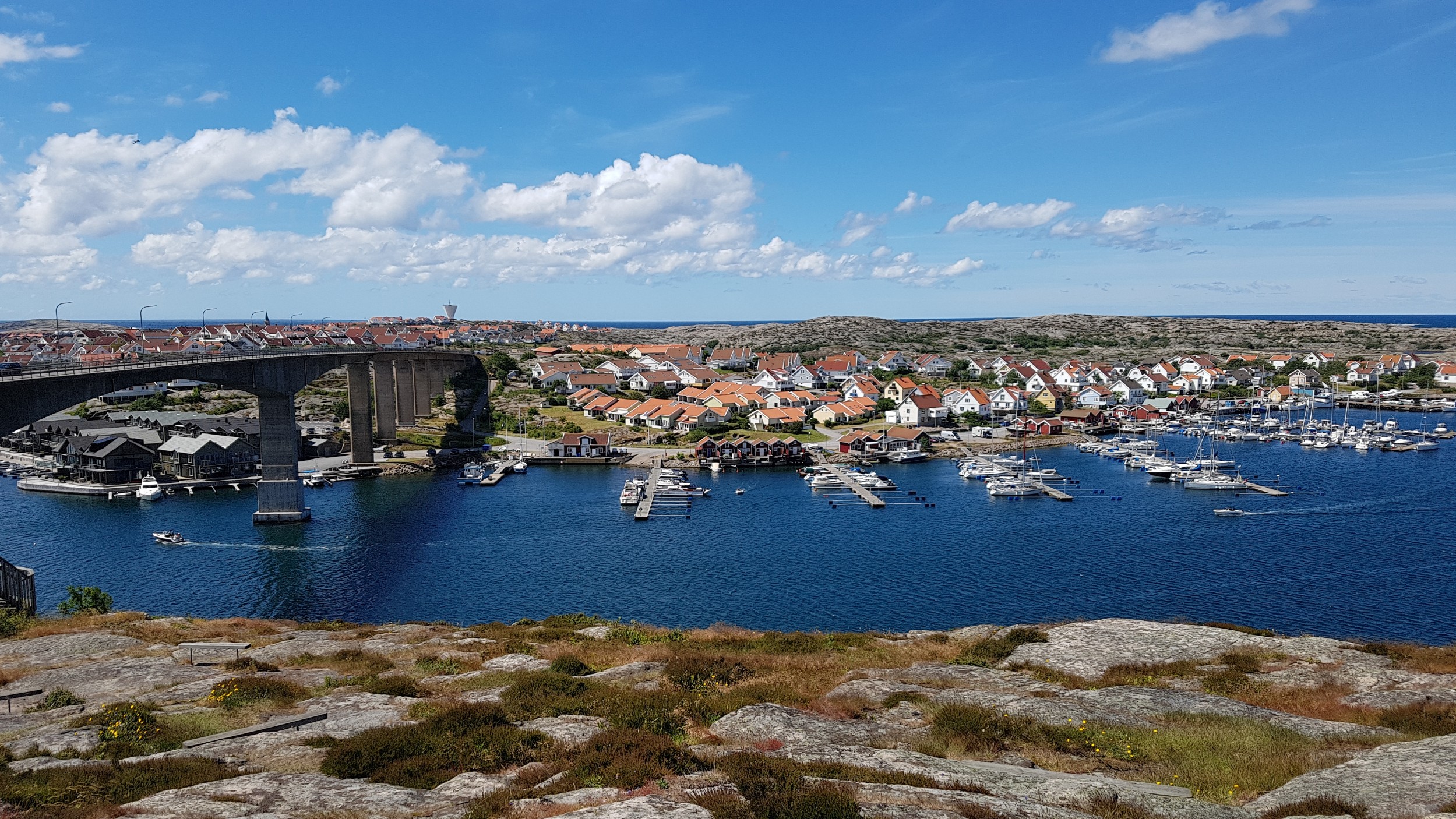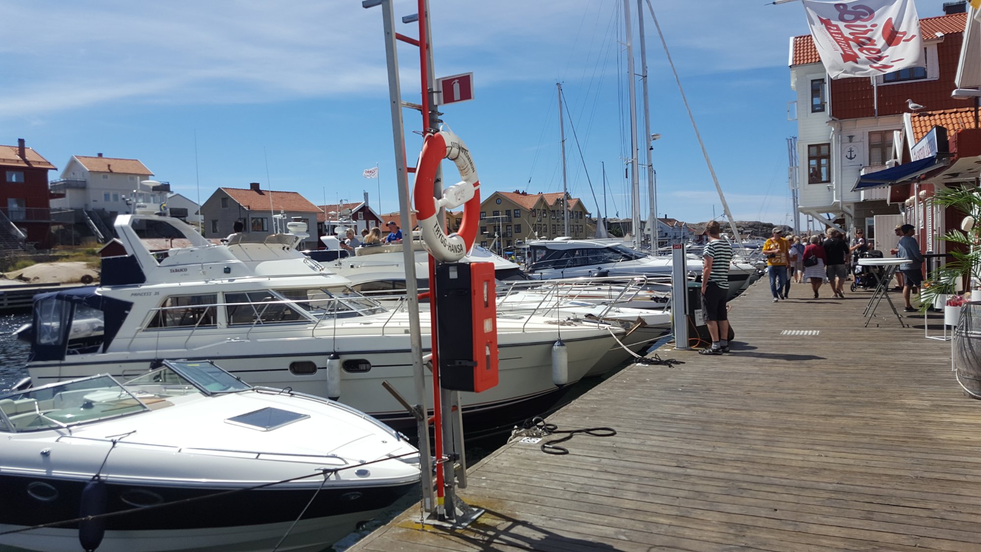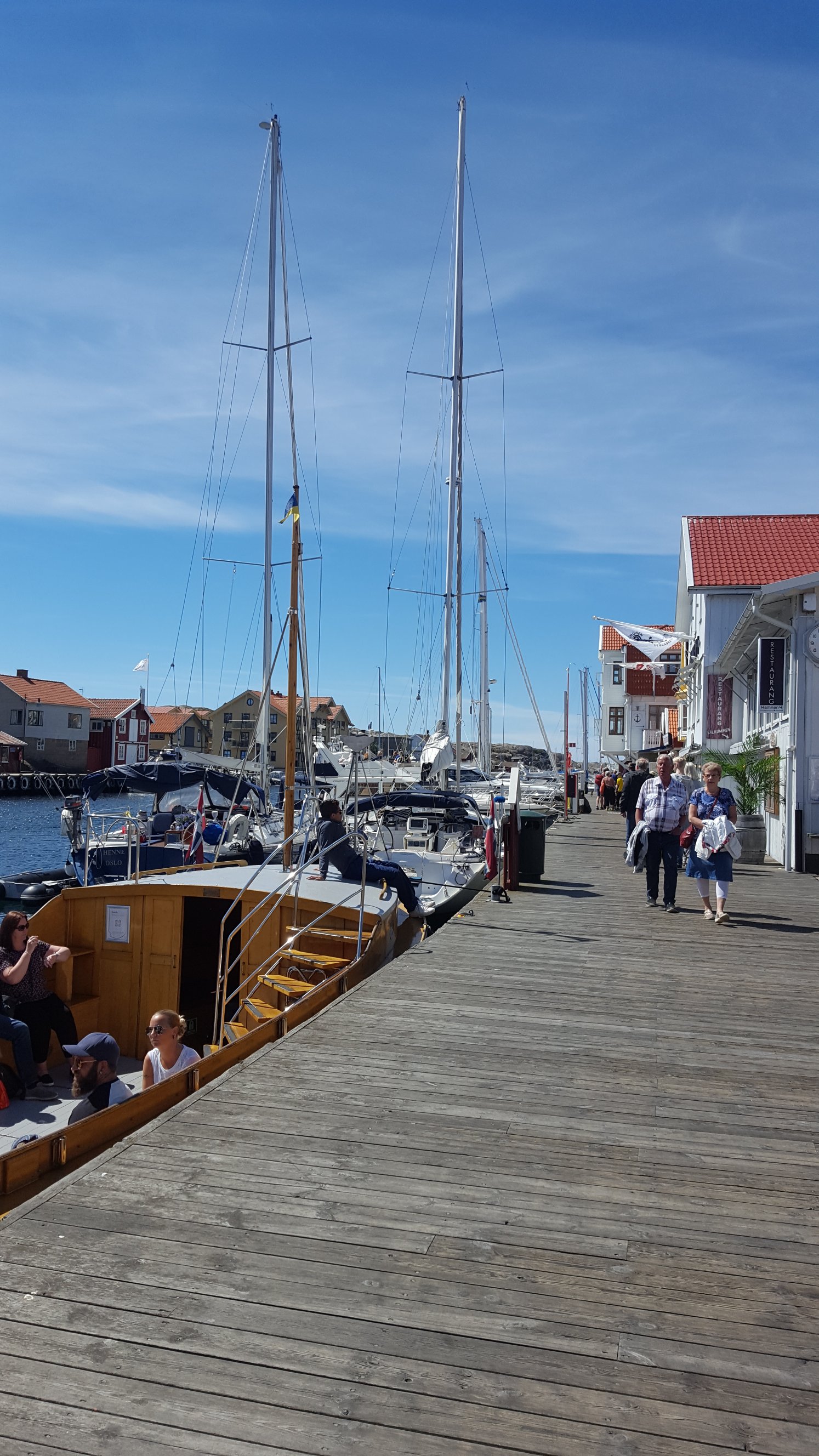 Vi kørte over broen og gik ned til bryggen i Smögen. Her ligger de dyre både til kajen og der er mange fiske restauranter og butikker.