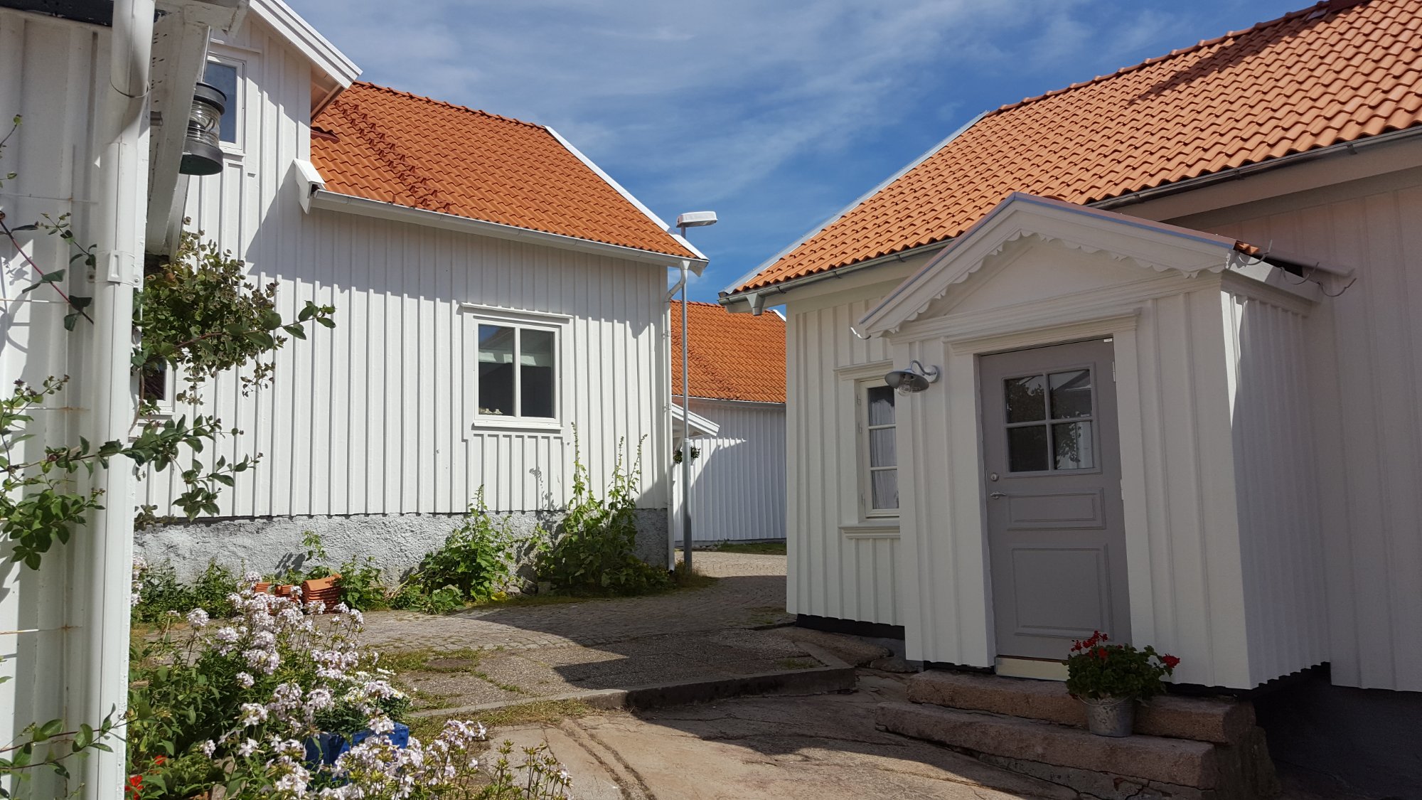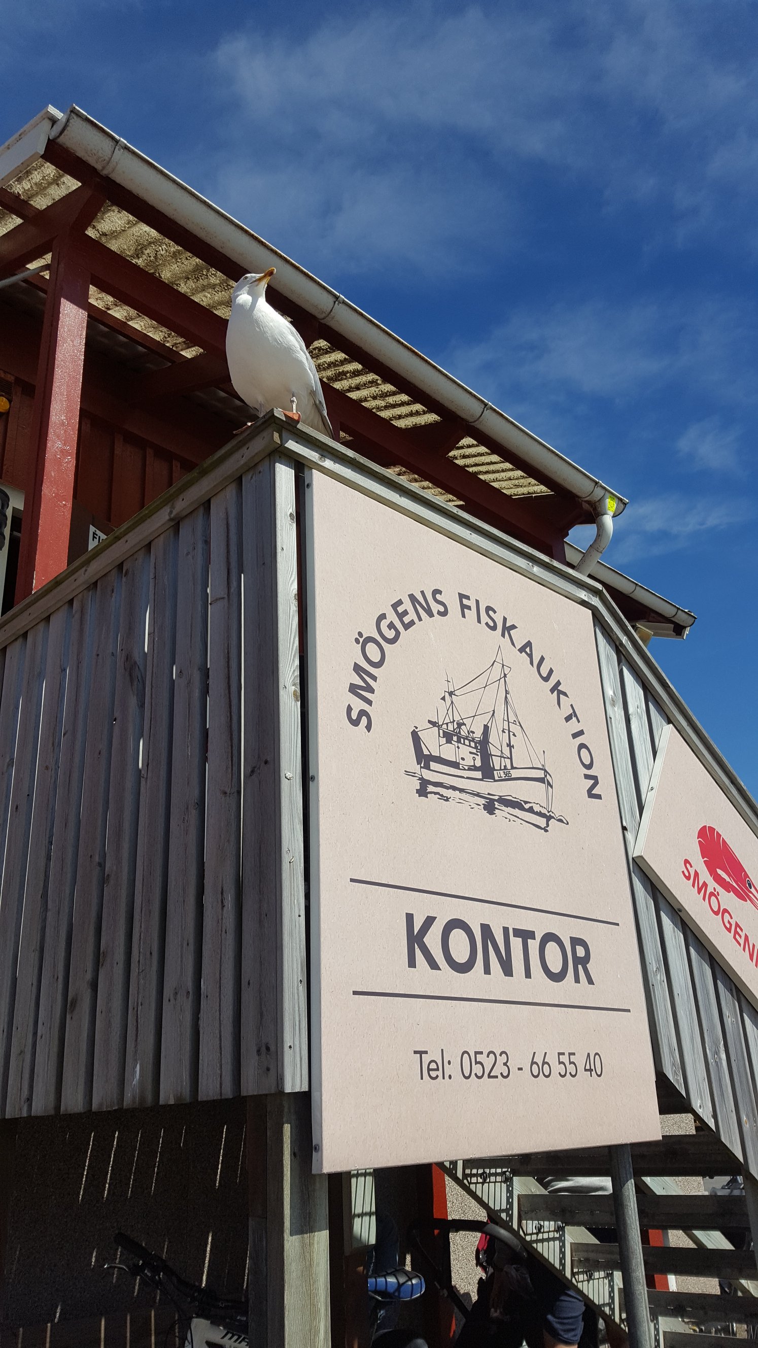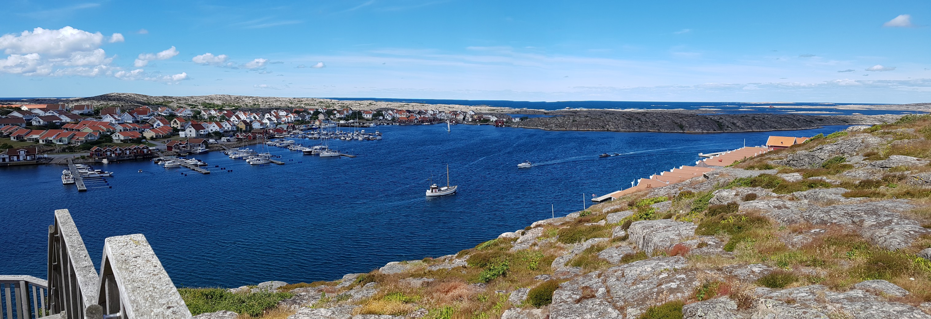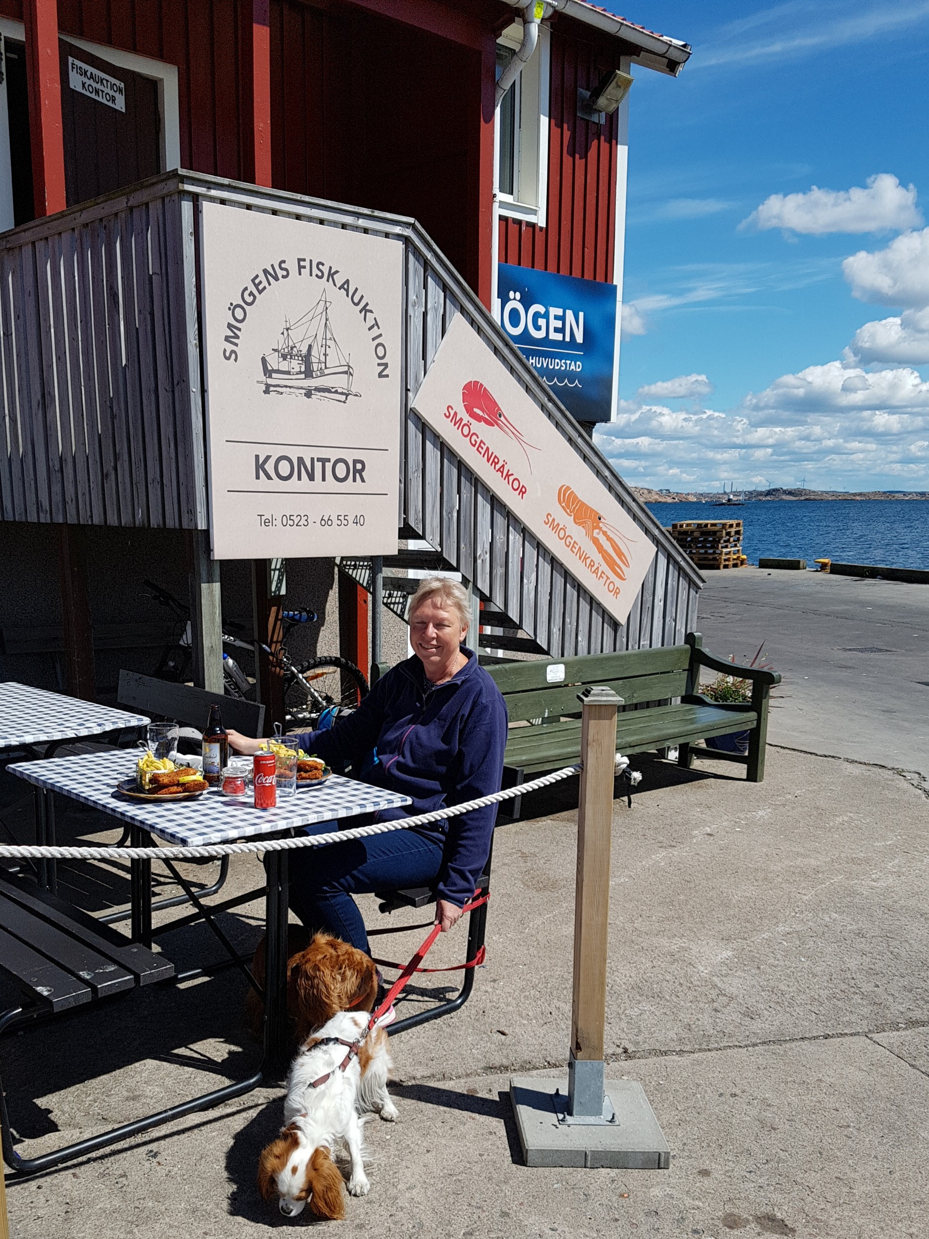 Vi kørte over broen og gik ned til bryggen i Smögen. Her ligger de dyre både til kajen og der er mange fiske restauranter og butikker.