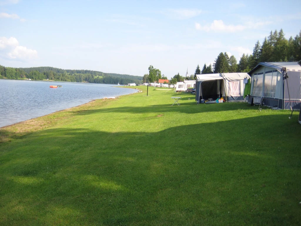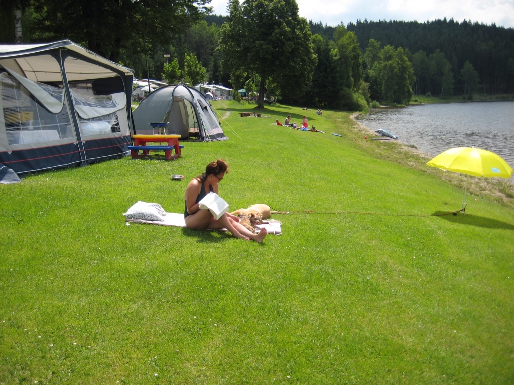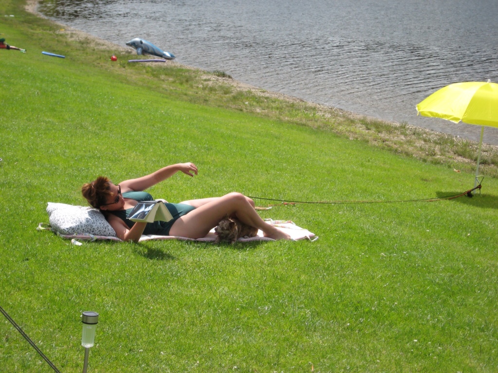Her er tredive grader, men vi får sat det hele op, henter pizza og hygger os i forteltet. Desværre er pladserne meget små og her er mange myg. Til gengæld er bad og toilet uroligt flot og der er fuld skygge på alle pladser.