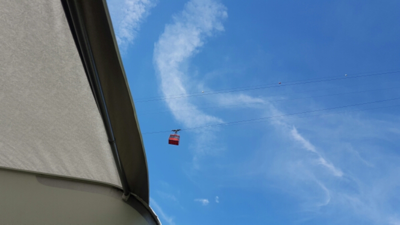 Nu sidder vi hjemme under solsejlet og følger svævebanen som er lige over campingpladsen. Om lidt når solen går ned bag bjerget pakker vi sammen og drager nord på kl. Halv otte i morgen tidlig.
